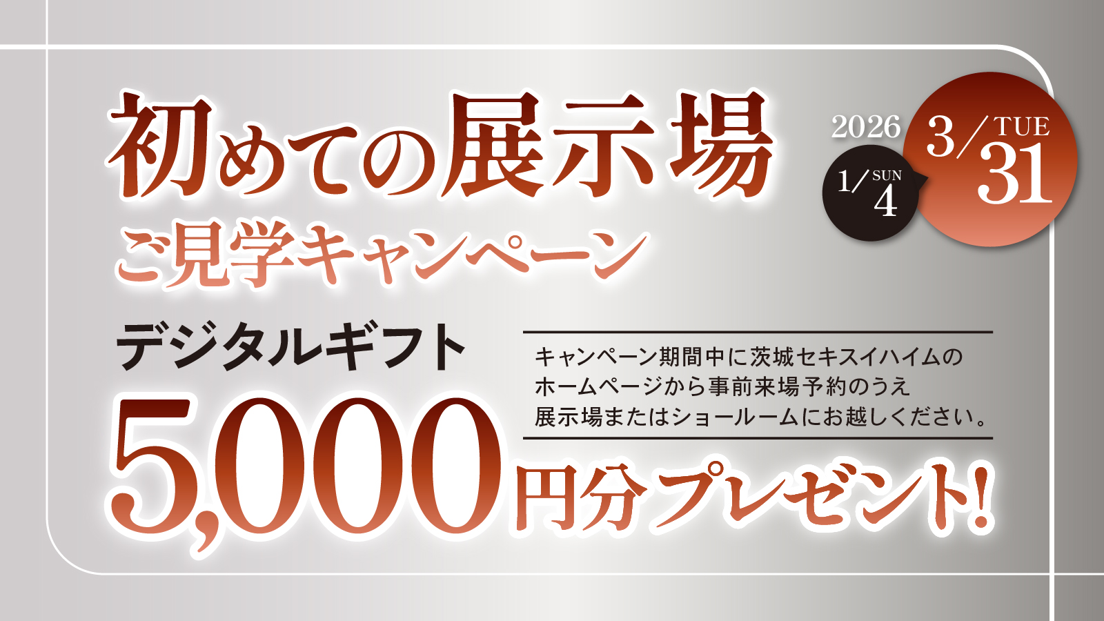 3月31日(火)までの期間限定で、WEBでの事前予約の上、展示場にお越しいただいたお客様にデジタルギフト5,000円分プレゼントいたします✨✨